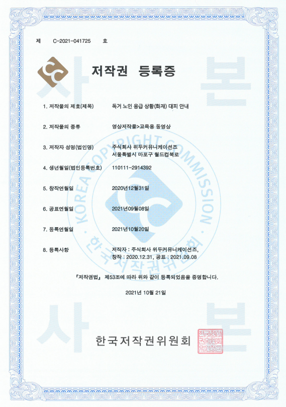 [한국/저작권] 독거 노인 응급 상황(화재) 대피 안내 페이지 정보 작성자 WeDu 댓글 0건 조회 6,241회 작성일 21-12-31 12:41 본문 2021-10-21 저작권 C-2021-041725 영상저작물>교육용 동영상 List Previous[한국/저작권] 장보기 인지훈련 게임 21.12.31 Next[한국/저작권] OLL KIDS/MATH 21.12.31
